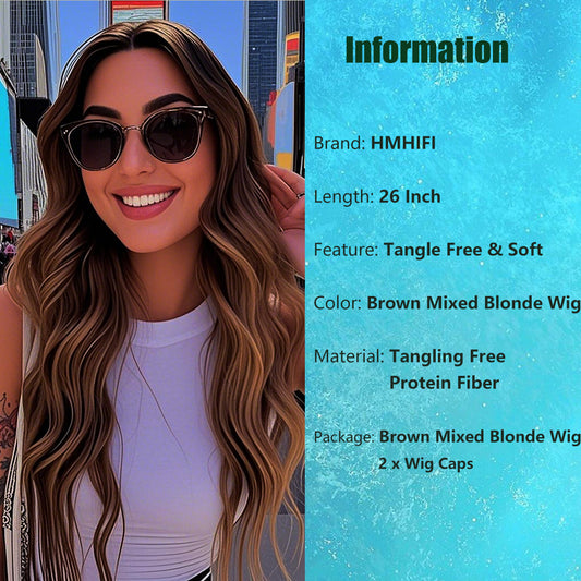 Long Ombre Brown Highlights Blonde Wigs for Women 26 inch Wavy Curly Middle Part Hair Wig Tangle Free Protein Fiber Wig