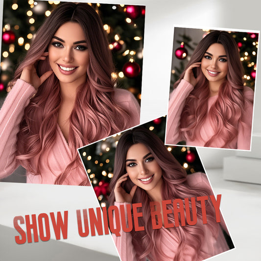 Long Ombre Pink Wigs for Women 26 inch Wavy Curly Middle Part Hair Wig Tangle Free Protein Fiber Wig