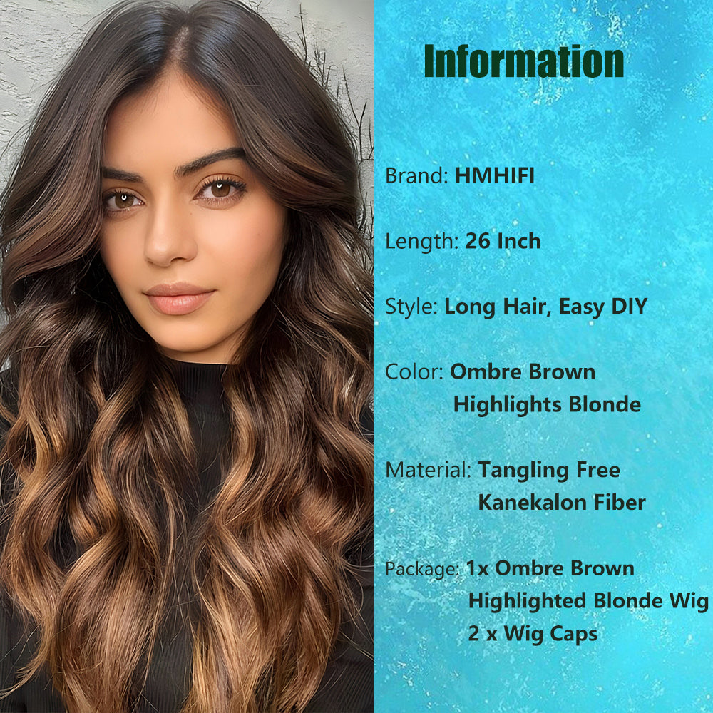 Long Ombre Brown Highlights Blonde Wigs for Women 26 inch Wavy Curly Middle Part Hair Wig Tangle Free Protein Fiber Wig